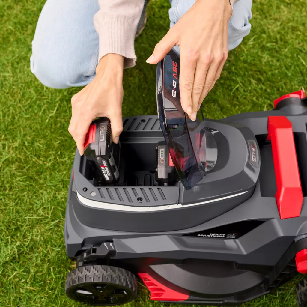 Nagy teljesítményű akkus fűnyíró rugalmas 18V/36V-os akkumulátorrendszerrel (1 akkumulátor - 2 feszültség). 2 db 2,5Ah-s akkumulátort és dupla töltőt tartalmaz.